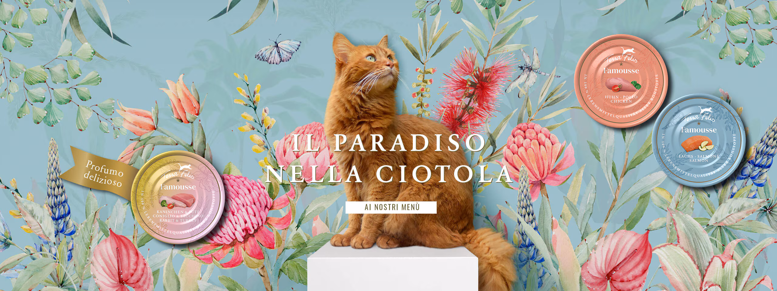 Terra Felis è la prima marca di cibo per gatti in commercio composta al 100% da ingredienti di qualità human-grade. Questa qualità straordinaria fa di Terra Felis la scelta migliore, se si desidera un alimento per gatti adatto alla specie. Riproducendo le prede naturali, che verrebbero cacciate dai gatti allo stato libero, Terra Felis offre un menù ricco di carne, dalle caratteristiche uniche, corrispondente alle esigenze dettate dall’evoluzione felina. La freschezza e l’alta qualità degli ingredienti si riconoscono già all’apertura della lattina e l’aroma delizioso ne sottolinea l’elevato standard qualitativo.